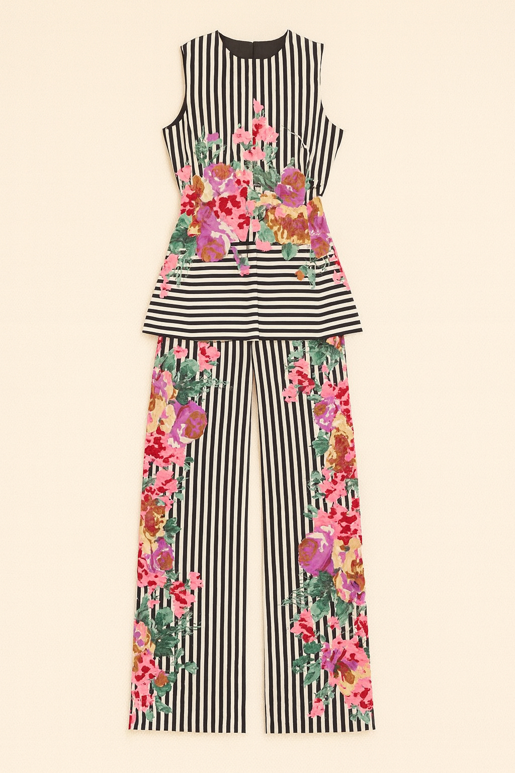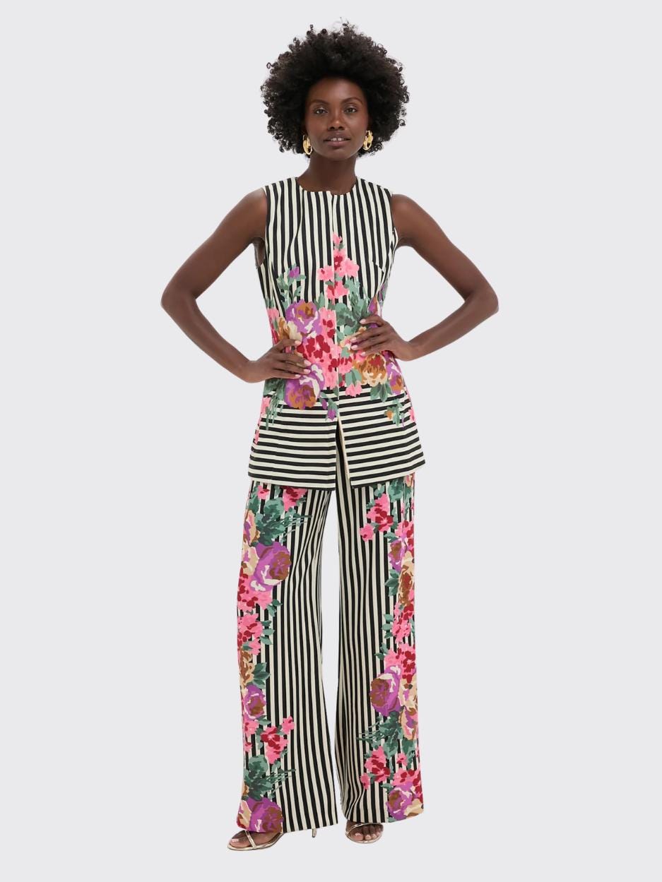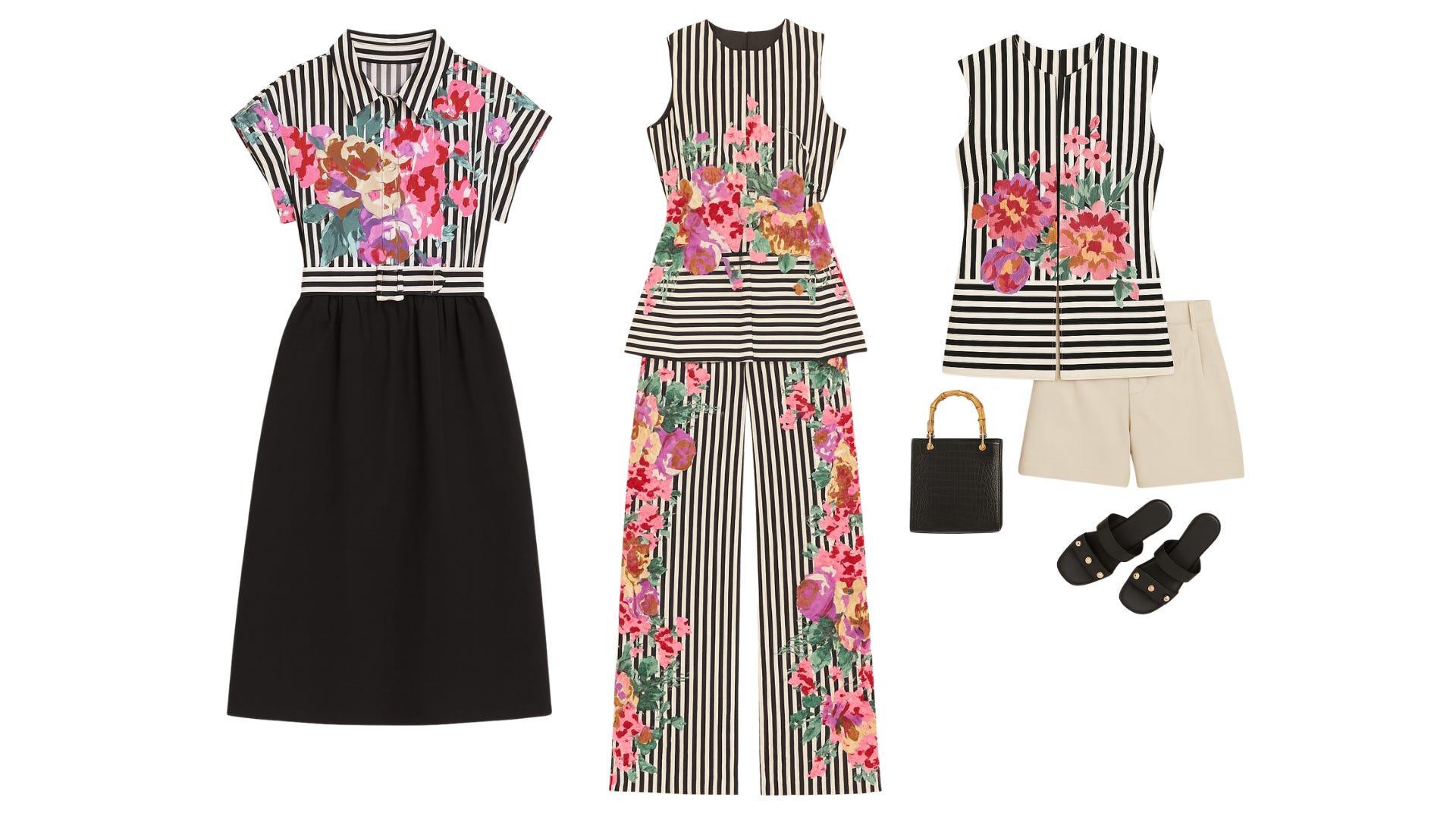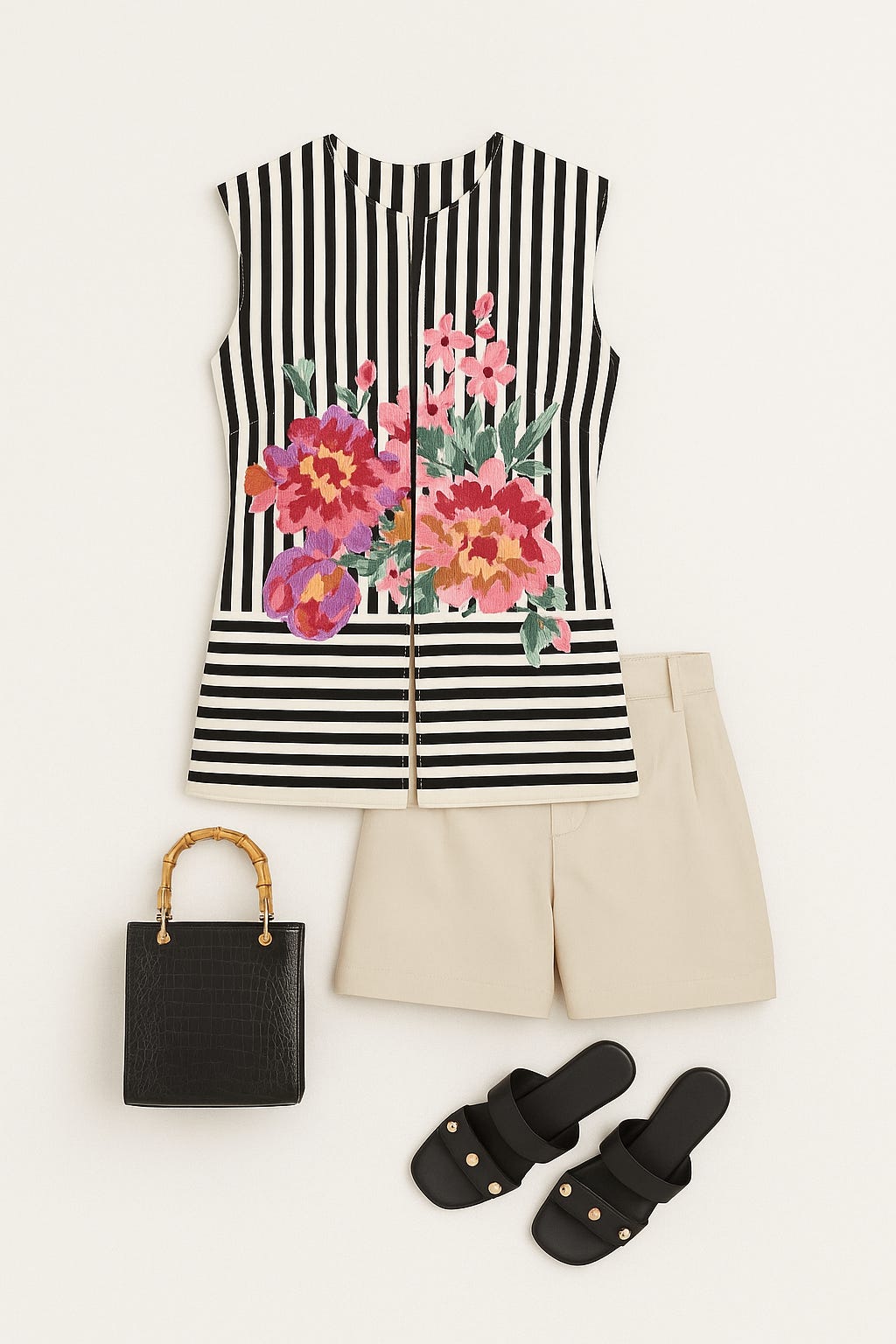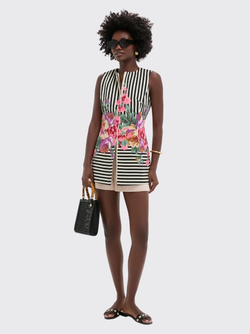 A bold black-and-white striped sleeveless tunic is brought to life with an explosion of oversized, painterly florals in fuchsia, coral, lilac, and green. The vertical stripes elongate the silhouette, while the floral overlay adds vibrancy. It’s paired with tailored neutral shorts for a fresh, modern contrast.