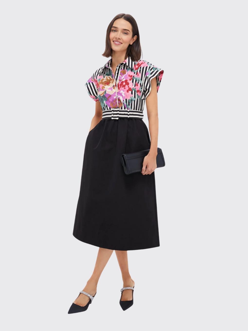 A crisp short-sleeve collared shirt dress features a bodice of vertical black-and-white stripes topped with vibrant watercolor florals. The waist is defined by a matching striped belt, before transitioning into a solid black midi skirt for a sophisticated, grounding finish. The look balances bold pattern with timeless tailoring, making it equally at home in the office or at an outdoor event.