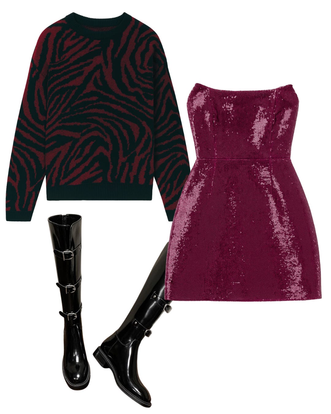 This look is the definition of cool-girl holiday dressing. The rich plum sequin mini brings instant party energy, all shimmer and glamour. We’ve paired it with a rich animal-print sweater that adds warmth, attitude, and that slightly undone, fashion-insider contrast. Tall black buckle boots ground the entire outfit with a tough, glossy edge, giving the sparkle something to play against. The result? A festive look that’s equal parts glam and gritty.