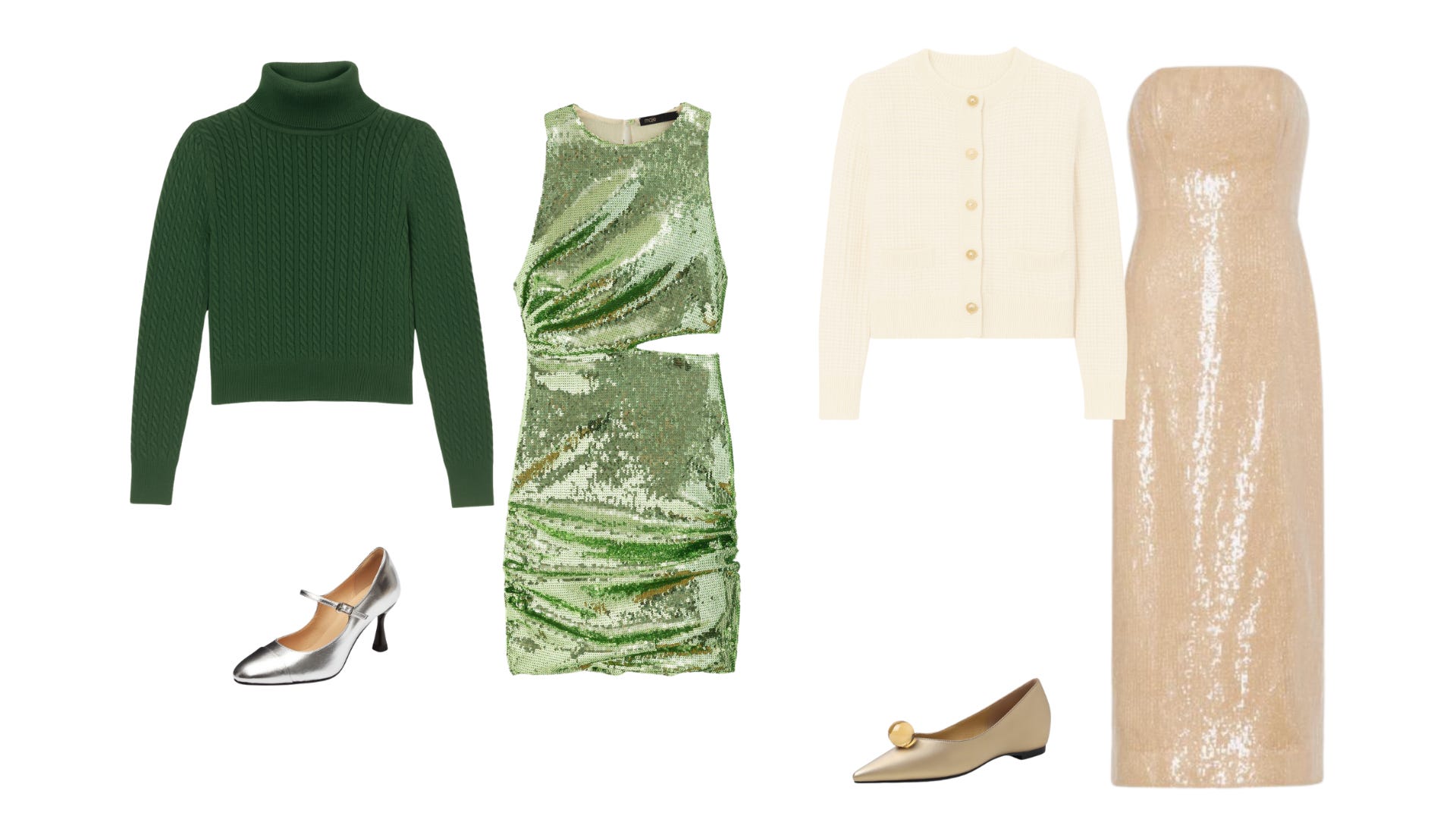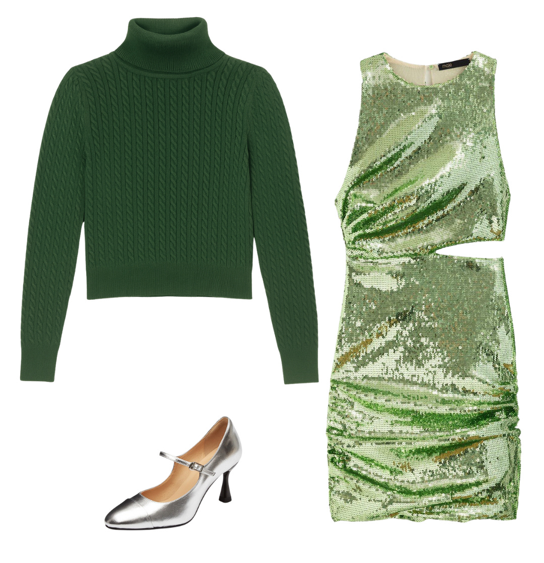 This look is equal parts cozy, glam, and impossibly chic. The deep green cable-knit turtleneck grounds the outfit with classic winter texture, while the metallic green sequin dress brings full-throttle sparkle and a modern silhouette. Paired together, they strike that irresistible balance of warm-meets-wow, the kind of high-low styling that feels effortlessly fashion-forward. A silver Mary Jane heel finishes the look with a hint of retro charm and just enough shine to echo the sequins without competing with them.