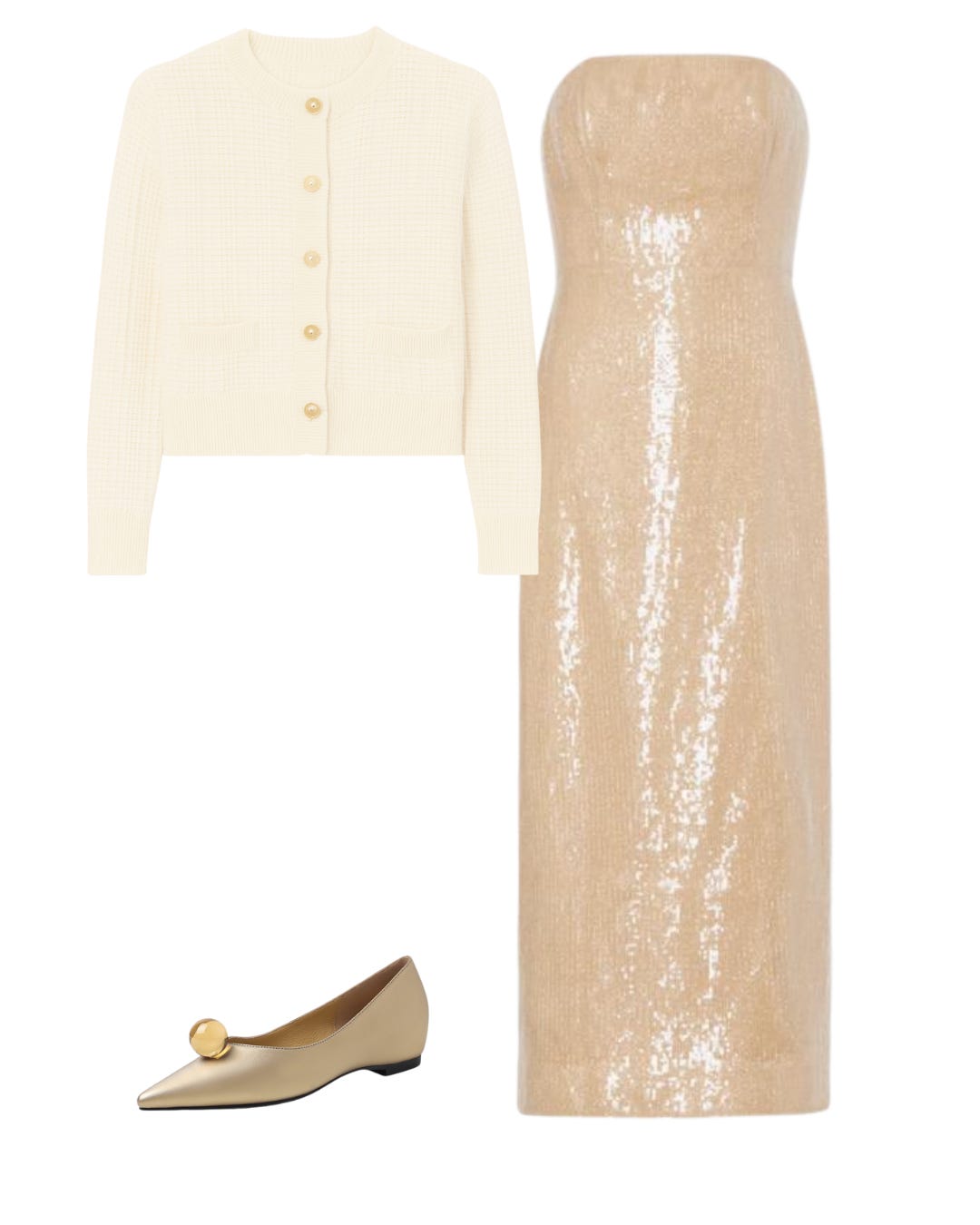 This look is pure understated glamour. It’s the kind of elegance that whispers rather than shouts. The champagne sequin column dress delivers a soft, luminous sparkle that feels both luxurious and impossibly refined. Layering it with a creamy, tweed knit metallic cardigan adds warmth and a touch of vintage polish. The gold flats with the sculptural orb detail tie everything together with modern, minimalist shine, keeping the outfit comfortable yet elevated. It’s a study in tonal dressing—graceful, glowing, and radiant without trying too hard.