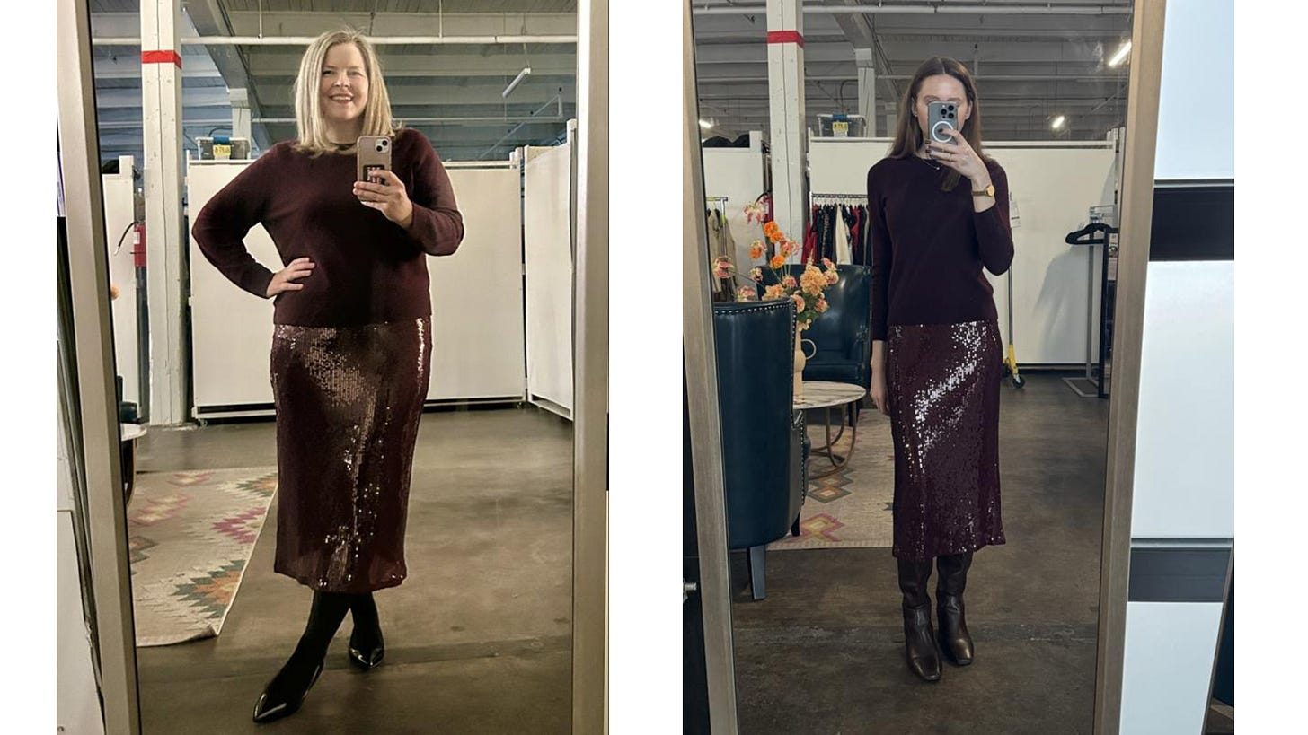 Two impeccably stylish members of the Armoire team recently wore the look and absolutely shimmered. They both looked so effortlessly dazzling that it got us thinking… what other sequin dresses in The Big Closet are practically begging for a knit companion?